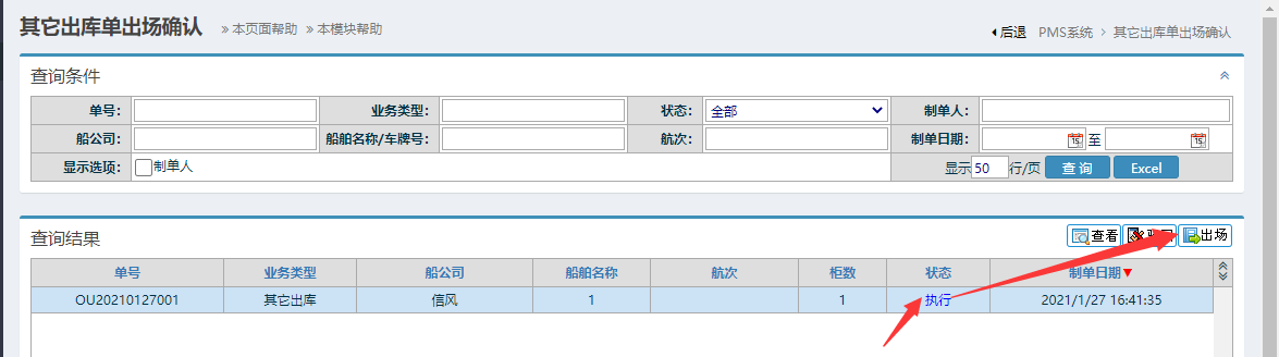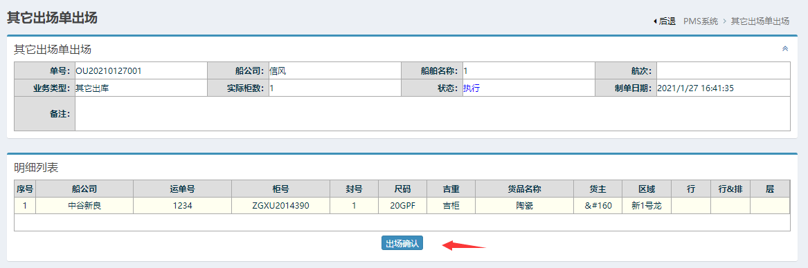 进入页面后,点击出场按钮-再点击”出场确认“按钮完成操作