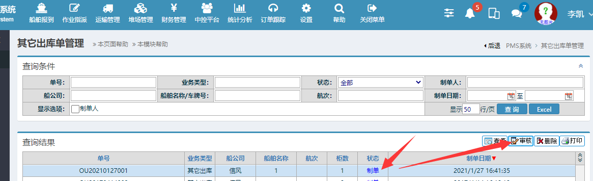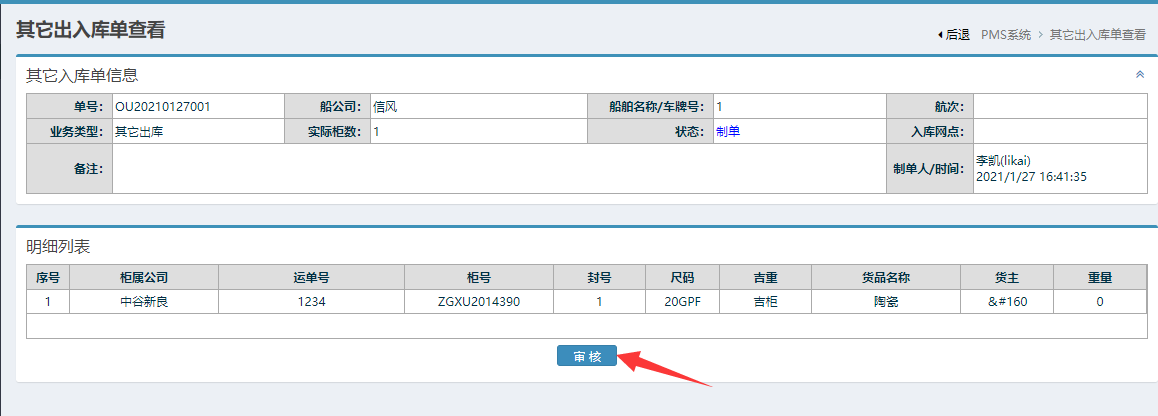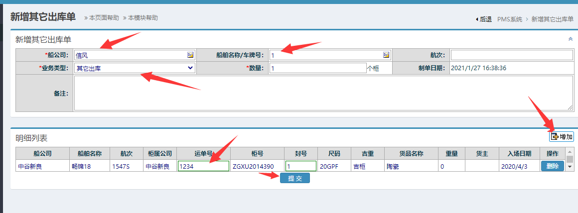 进入页面后,选择对应船公司-录入车牌或船名-选择业务类型为其他出库-点击增加按钮添加出库货柜-确认后点击提交按钮