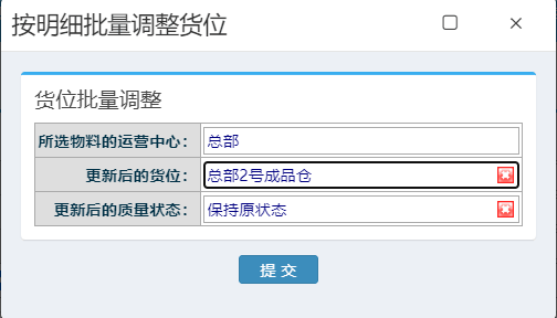 弹出下图页面,点击选择调整后的货位和质量状态,点击提交即可: