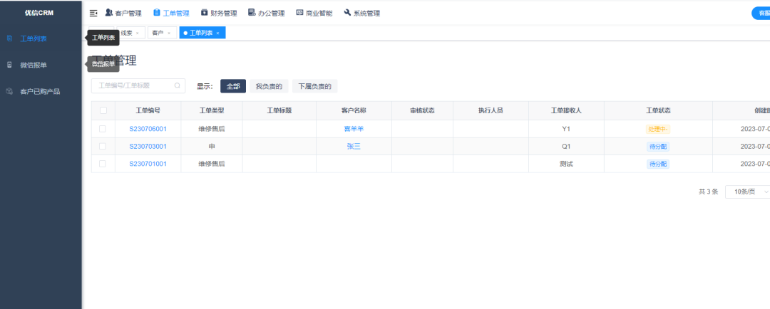 三、销售管理 对于CRM客户管理系统重要的就是销售管理,包含销售的目标,计划,工作流程,跟进记录,工作效果,都是可以在系统中看见的。 1、给销售分配任务,线索和公海可以自己领取可以自己分配,也可以自动回收,二次跟进。 2、外勤签到,进行大地图的精准定位。 3、规范销售的工作流程,进行商机的二次跟进。 4、不同权限的分配,针对不同的销售可以进行不同权限的分配 四、售后管理 这里使用的就是工单管理了,可以提高客户的满意度,客户的退单,维修都是可以从系统中完成的。业务覆盖不同的部门,进行全流程的闭环管理。