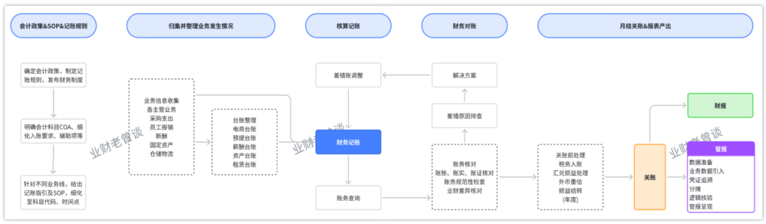 财务月结由财务核算和管理会计共同完成,财务核算主要负责业务入账和账务检查,包含系统账和手工账两部分。系统账很好理解,是由系统自动化产出的账务数据,如销售出库单下推应收单,采购入库下推应付单,应收应付单生成记账凭证。对于手工账的部分,一般是因为公司业务的变化比较快,有些业务属于创新型快速迭代的业务,优先考虑对C端用户体验的完整性,没有进行系统的支撑,这也是基于迭代效率考虑的。这种情况就需要财务人员在月度手工进行收入、成本费用的核算。月结时间一般是月结期间的Day1到Day5。这个Day指的时间,一般是月初非节假日的第一天算Day1,有些要求严格的企业,无论是否节假日,均是月初1号至N号,N号必须结完账。这个数字N越小越好,管理层就能越早获取到精准、全面的数据。比如华为任总就曾说“提前1天结账,价值一个亿!”在结账的这段时期相关同学不分白天黑夜,不管你是在家还是在公司,到点必须关账,工作非常辛苦,也被戏称“月劫”