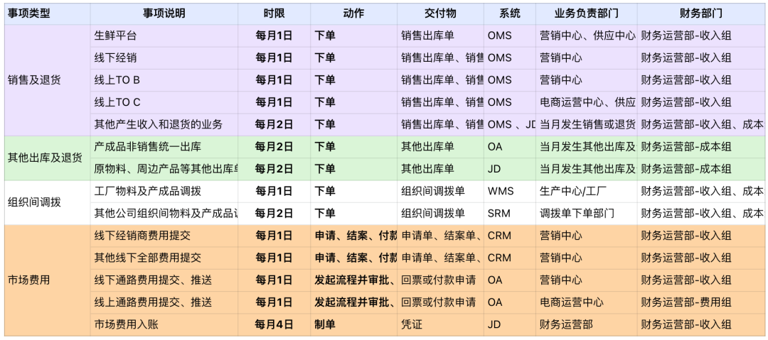 。入账完成之后还要进行账务核对和检查,保障本月财务核算数据的准确性。所有入账任务都确认完成之后,当月账期关闭,形成一份财务核算数据的快照,即单主体的账期关账。单主体账务完成之后,需要进行各主体的报表合并,并结合业务数据产出管报和经分报表,给到管理层做分析决策。实操中,财务月结是公司所有人通力协作、共同努力的结果,为了规范月结流程、确保月结质量,制定有效可行的SOP能大大减少月结事故和差错的发生。财务月结主要关键在两大块,时间维度(及时性)、数据质量(差错率),如单据审批或提交不及时,提交的数据有差错,都将对月结造成负面影响。针对这两大块,我们总结出财务月结节律制度即月结SOP,具体如下: