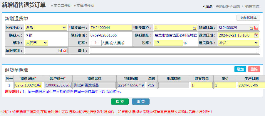 根据与客户确定的方式,选择退货操作为:退款补货。为了更精确追踪单据,可以自定义设置和选择单据子类别。新增退货单时,要求选择所属的退货客户、销售单号等信息,并且挑选退货物料时,只能从此销售订单所对应的送货单中选择。确认各项信息正确无误后,点击“提交”。