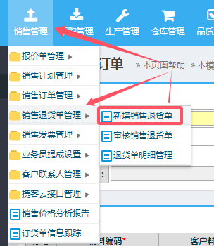 销售发生退货时,进入菜单:ERP系统-》销售管理-》销售退货管理,点击“新增销售退货单”: