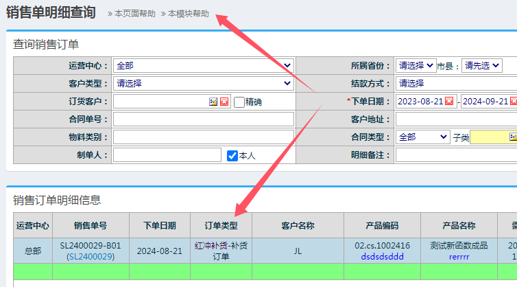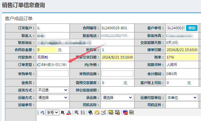 在销售订单查看页面中,可以看到订单类型为:红冲补货(补货订单)