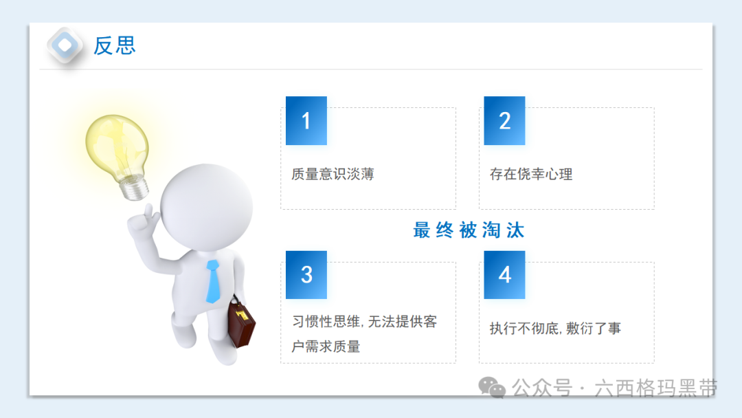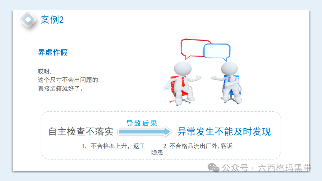 让我们来看一些质量意识缺乏的案例。案例1、案例2、案例3、案例4和案例5,这些案例都反映了我们在工作中可能遇到的一些问题。比如,小小的错误被忽视,最终导致小事变大事;原物料屡屡领错,反映出我们的管理存在漏洞;对工作要求理解不清,盲目操作,等等。这些案例给我们敲响了警钟,我们必须从中吸取教训,避免类似问题的发生。