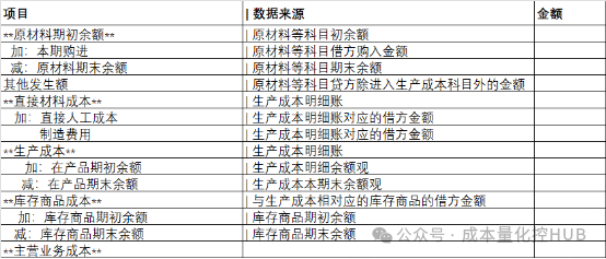 如何编制: 从原材料采购到主营业务成本的过程就是成本倒轧表的填列过程。 一个原则: 成本倒轧表的倒轧原则:“与实现本步骤目的无关的操作,就剔除。” 成本倒扎表剔除了生产成本中重复结转的金额,其目的是 吹糠见米。 六个步骤: 第一步:计算直接投入生产直接材料的原材料 直接投入生产直接材料的原材料=①原材料期初数+③本期原材料借方-②原材料期末数-④剔除项 这里说下很容易导致最终成本倒扎表扎不平的坑-----剔除项: 1.原材料盘亏:原材料盘亏成本硬生生少了,没有在本步骤投入生产,要剔除; 2.原材料被研发领用:研发领用当然没投入生产,要剔除; 3.原材料办公领用:没投入生产,要剔除; 4.原材料委外加工领用:委托加工物资在本步骤并没有直接投入生产,就要剔除。 原则“与实现本步骤目的无关的操作,就剔除”,虽然委外加工最终投入了生产,但是在这一步并没有,就要剔除。 5.原材料计入制造费用:有专门“直接人工”“制造费用”的项目来涵盖。 6.原材料直接销售:原材料直接销售了,无论是计入主营业务成本,还是计入其他业务成本,因为在这一步没有直接投入生产,那就要剔除。 7.其他非投入生产的剔除项:上面罗列了一般生产企业原材料贷方没有计入生产的主要剔除项。如果还有其他的也要剔除。 第二步:计算生产成本本期增加额 生产成本本期增加额=直接投入生产直接材料的原材料+直接人工成本+制造费用 原材料投入生产后,在工人操作下,再投入水电、设备、房租等制造费用,就是本期投入到生产的成本。 第三步:计算产成品生产入库成本 产成品生产入库成本=在产品期初金额-在产品期末金额+生产成本本期增加额-剔除项 第四步:计算产成品销售出库金额 产成品销售出库成本=产成品期初余额-产成品期末金额+产成品盘盈金额+退货收回产成品成本+外购的成品入库金额-自制自用产品成本-内部领用产品成本-产成品折价盘亏报损-委托加工物资领用库存商品-研发领用产成品-其他剔除项 第五步:计算产成品销售结转主营业务成本 如果存在发出商品的话,产成品的销售出库金额一部分结转了主营业务成本,一部分计入了发出商品,所以需要考虑期初发出商品和期末未结转成本的发出商品,才是产成品结转主营业务成本的金额。 如果企业将直接销售的原材料和半成品计入了主营业务成本,那么这里需要再加回来。 第六步:核对调整 在核对前,还要将非产成品、非原材料、非半成品销售计入主营业务成本的等项目挑选出来,比如销售物流费、仓储费等,然后将倒轧出来的销售成本与报表主营业务成本进行核对。如果还有差异就要再返回头看一下是哪一项漏了,或者数据统计不准确。 逻辑一致 — 剔除项: 上述描述的内容为从原材料到主营业务成本的倒轧过程,实际过程中可能会涉及到 各式各样的例外情况,这些需要在相应的项目下进行剔除或调整。 主要集中于原材料阶段和半成品的阶段,典型的有: