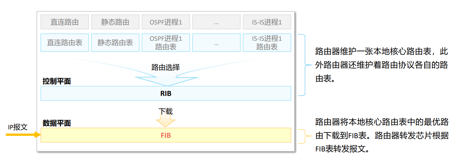 具有路由功能的网络设备都维护两种重要的数据表:一是路由表RIB(Routing Information Base,路由信息库);二是转发表FIB。