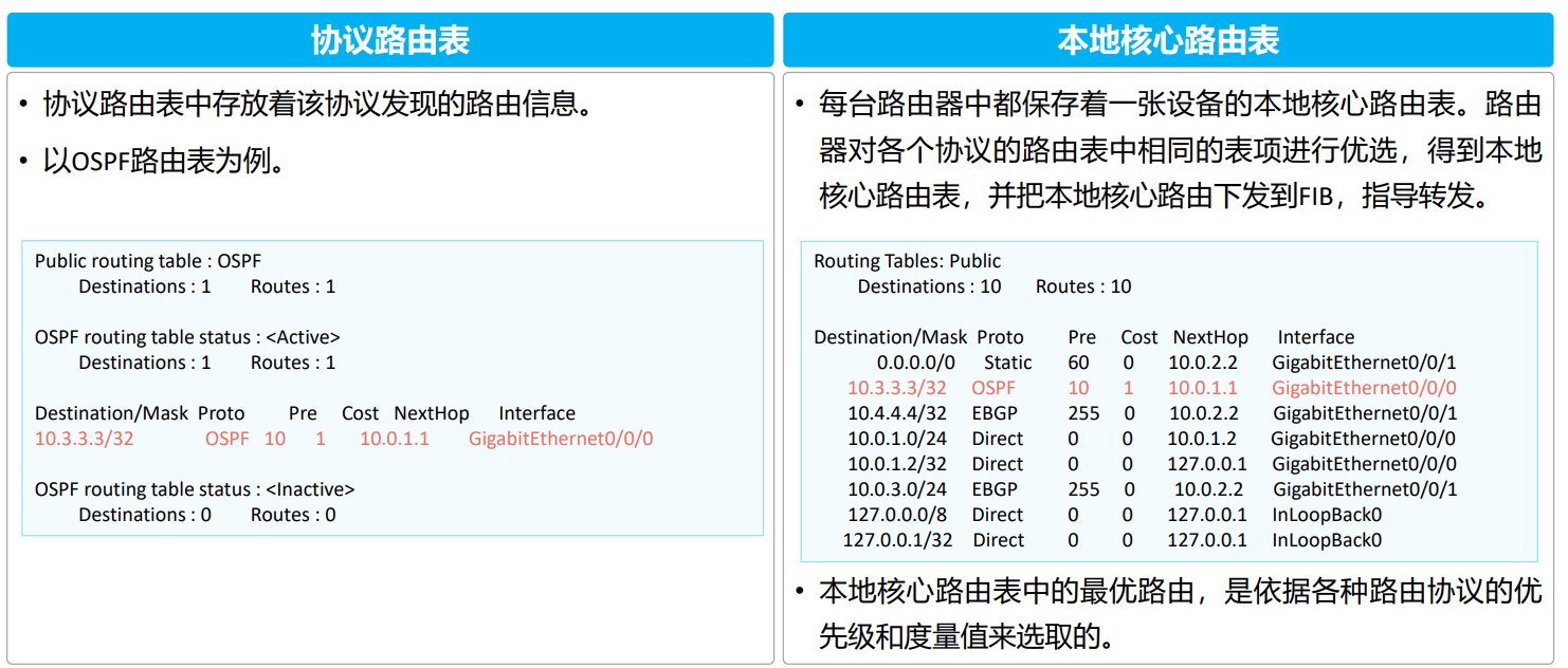 每个路由器都有路由表,而路由表又分为本地核心路由表和协议路由表。