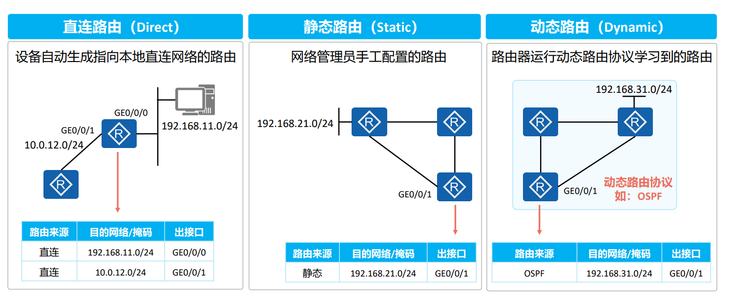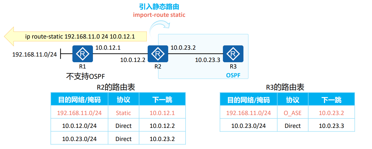 路由器获取路由的方式有三种,分别是动态路由(例如OSPF)、静态路由、直连路由。一个网络中可能会同时存在这三种方式,那么采用不同方式获取路由的路由器之间如何实现路由可达?