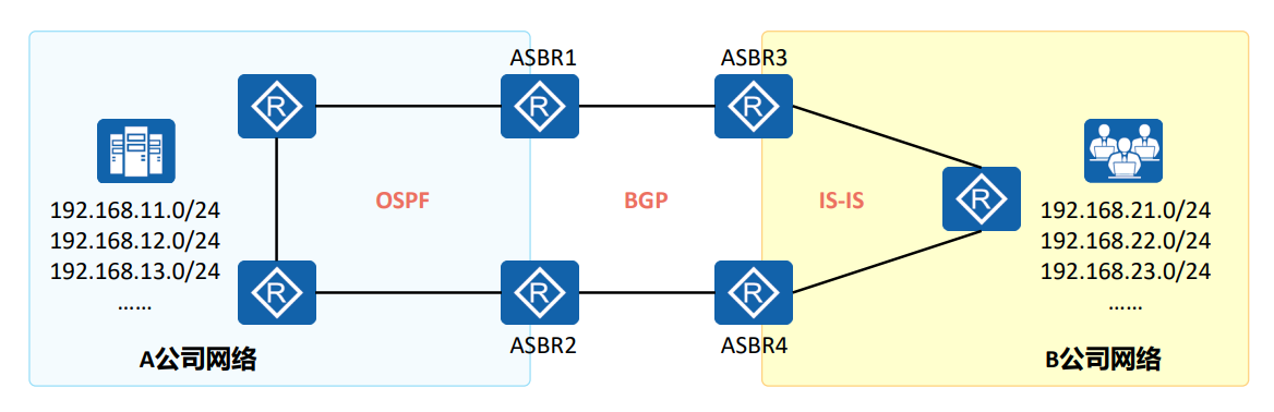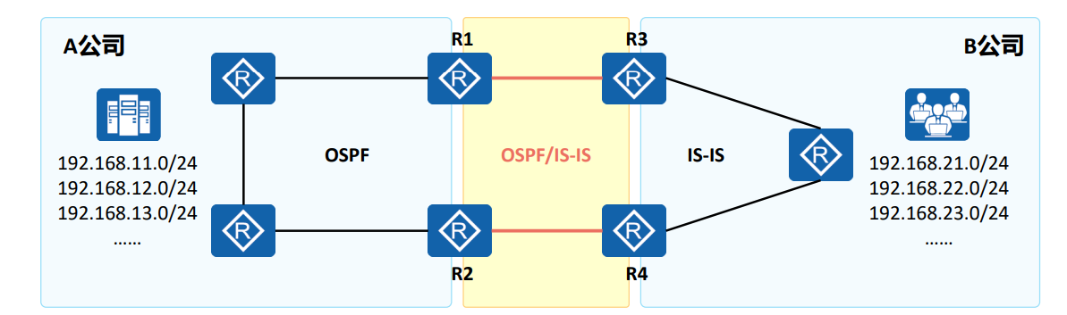 假设A公司和B公司各有自己的网络,这两个网络被独立管理及运维,A公司网络使用的路由协议为OSPF,B公司网络使用的路由协议为IS-IS。