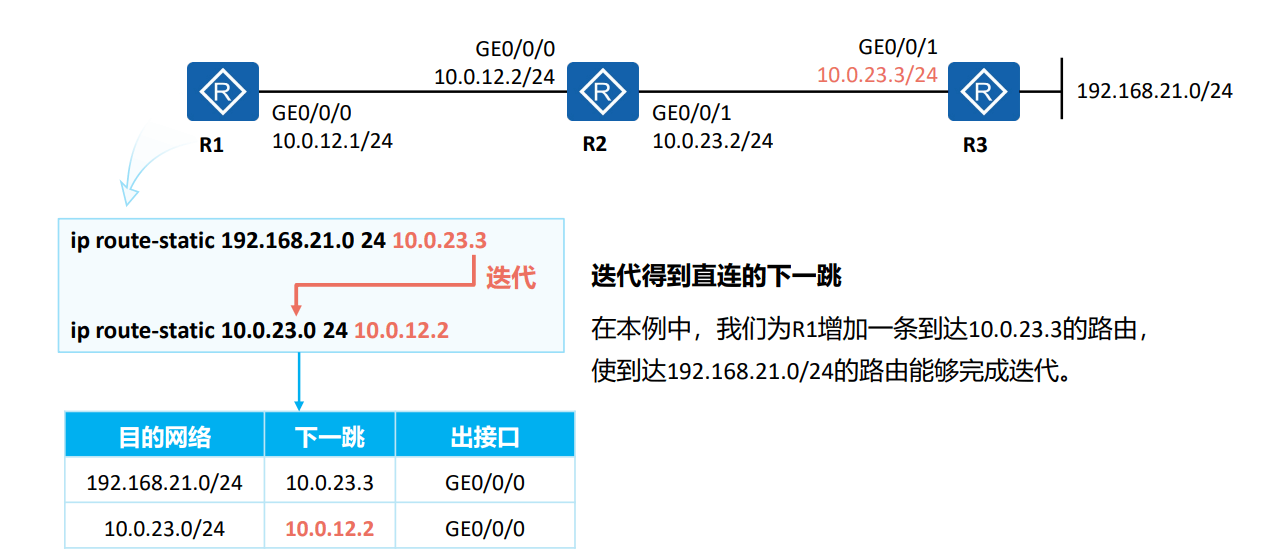路由必须有直连的下一跳才能够指导转发,静态路由或BGP路由的下一跳可能不是直连的邻居,因此需要计算出一个直连的下一跳,这个过程就叫做路由迭代。