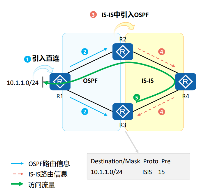 4. R3也会通过IS-IS学习到10.1.1.0/24网段路由(路由优先级为15)。