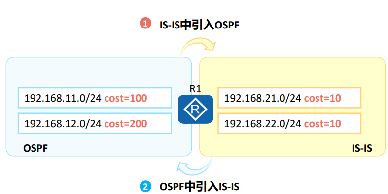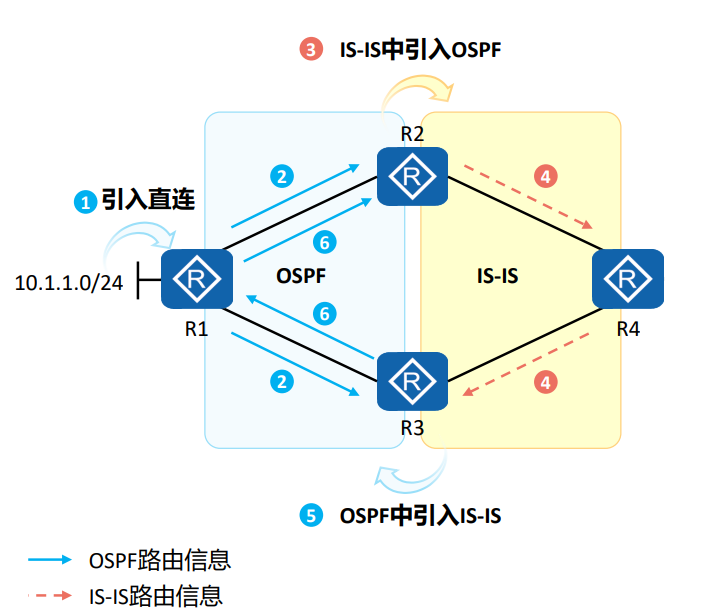 路由引入是具有方向性的,将路由信息从路由协议A引入到路由协议B(A-to-B),则路由协议B可获知A中的路由信息,但是此时,A还并不知晓B路由协议中的路由信息,除非配置B-to-A的路由引入。