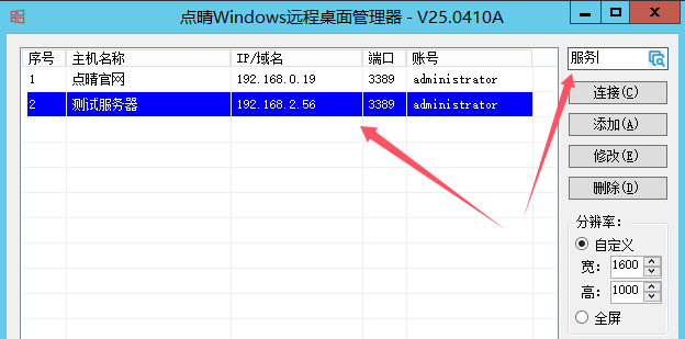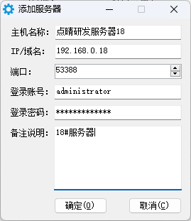 导读 点晴公司原创作品。之前用其他类似功能软件实现公司多台服务器的访问管理,但担心会窃取密码或造成密码泄露,另外主要是无法自定义窗口大小,导致使用时要么全屏,要么拖动远程桌面窗口滚动条,如果本地电脑有新信息提醒时,容易漏掉,很不方便,于是就有了这个免费作品的问世,欢迎各位管理员下载使用。 点晴Windows远程桌面管理器 是深圳市点晴信息技术有限公司开发的一款免费Windows远程桌面批量管理程序,本程序为单程序绿色软件,大小仅100KB,无需安装,直接下载到本地适当位置,然后双击打开运行即可。 程序特点: 1、可以实现大量Windows系统远程桌面的批量管理,最多可以管理999台电脑; 2、设置的Windows系统连接信息采用了结合用户密码的动态加密技术,即使拿到了配置文件也无法查看到实际的电脑名称、IP地址、登录用户名、密码、网址、备注等信息; 3、可以直接双击设置好的主机自动进入远程桌面连接程序,无需用户手工输入主机连接地址、用户名和密码; 4、为了确保信息安全,可以并应该设置进入密码,用户必须牢牢记住设置的进入密码,如果忘记了进入密码,那么只能删除ini配置文件,重新从零开始配置程序; 5、为了方便管理员长时间使用Windows系统远程桌面时,不被远程桌面程序遮挡正常的本地桌面,本程序允许设置自定义远程桌面窗口大小,用户可以设置远程桌面大小恰巧比本地桌面小一些,避免远程桌面出现滚动条,此功能可以将远程桌面完全模拟为本地窗口的一部分,非常实用; 6、可以设置主机绑定网址,方便直接访问主机上的网站; 7、支持远程开机(需要远程服务器硬件支持远程开机)。 下载地址: 附件:点晴Windows远程桌面管理器.rar(92KB) 使用方法: 1、下载执行程序 下载以上程序,解压到适当位置,双击执行,执行后会自动创建配置文件; 2、添加服务器 点击程序主窗口右边“添加”按钮: