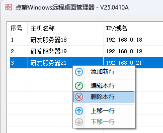 填入相关信息,备注中也可以输入补充信息,所有信息都会加密后保存在ini配置文件中。 在主程序主机列表窗口中,点击鼠标右键,可以进行编辑、删除、上移、下移、移动到指定行等操作: