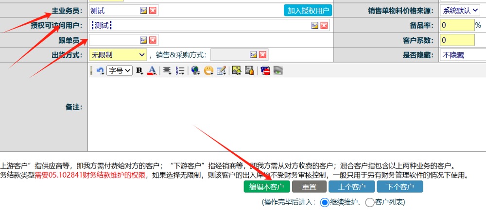 2、设置客户资料业务员绑定,以及访问权限,操作步骤如下: