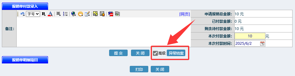 在录入付款的界面里勾选高级,点击异常结案即可,要求异常结案的单据未发生过付款,此时异常结案相当于作废报销申请,预算金额不受影响,报销单不会占用预算