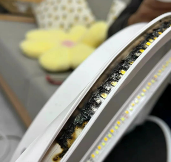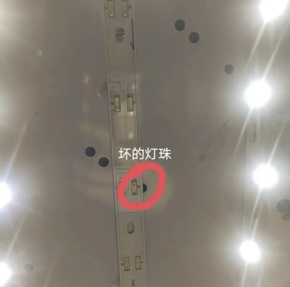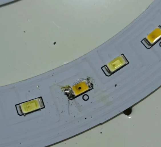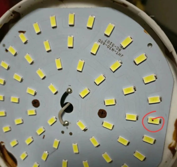 ②、LED灯内部被烧坏。这是比较典型的情况,用了一两年,打开以后发现里面好多小黑点。其实,这些都说明了里面的电路被烧坏了。