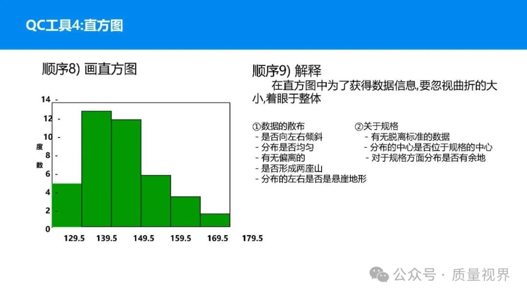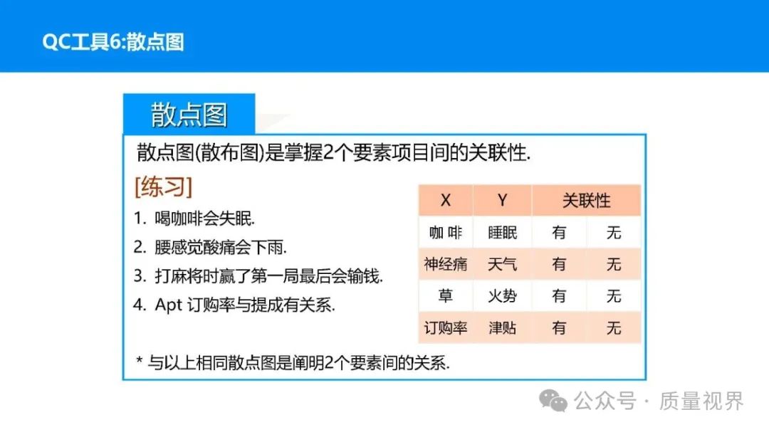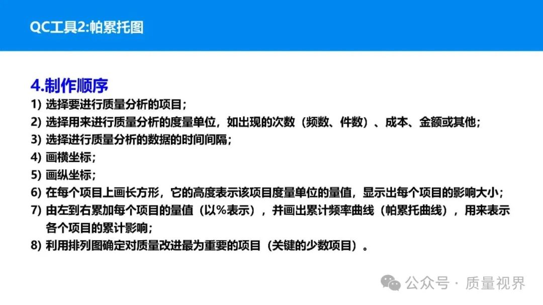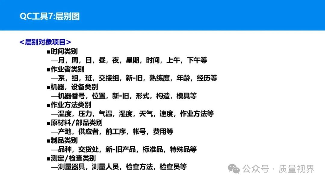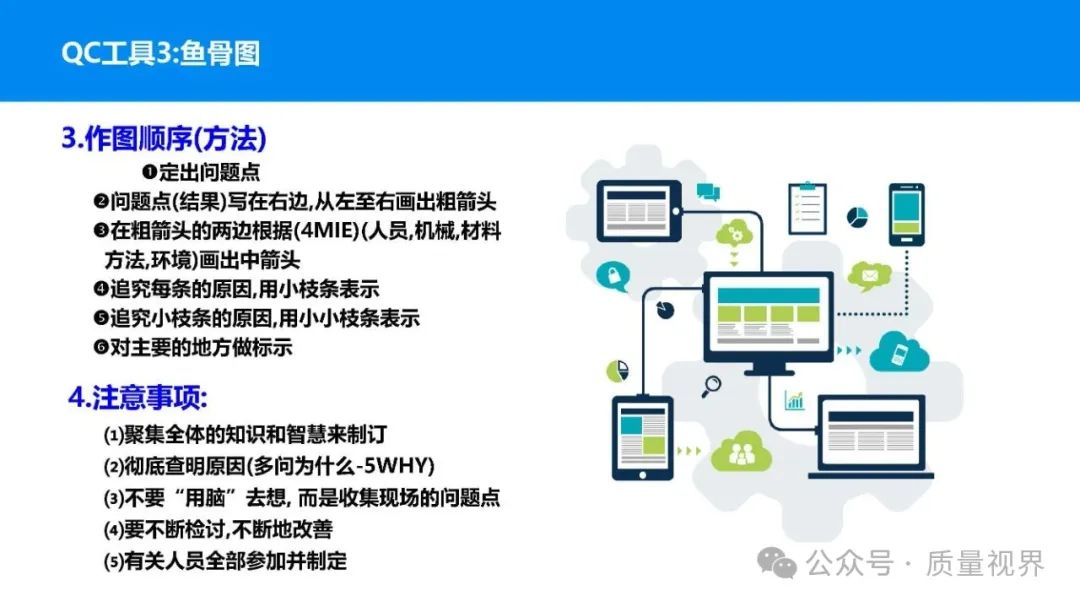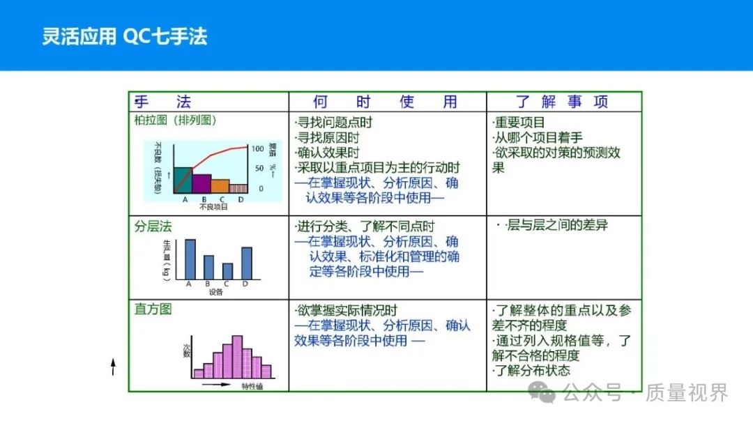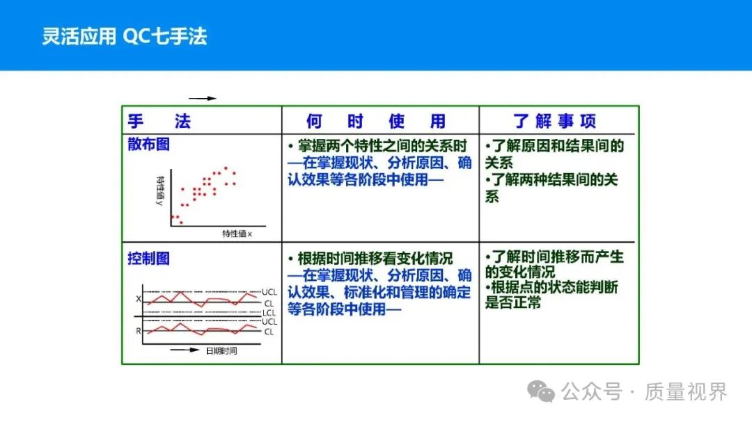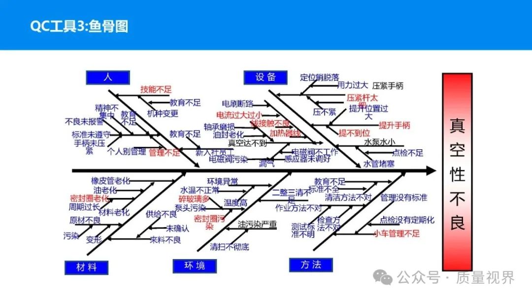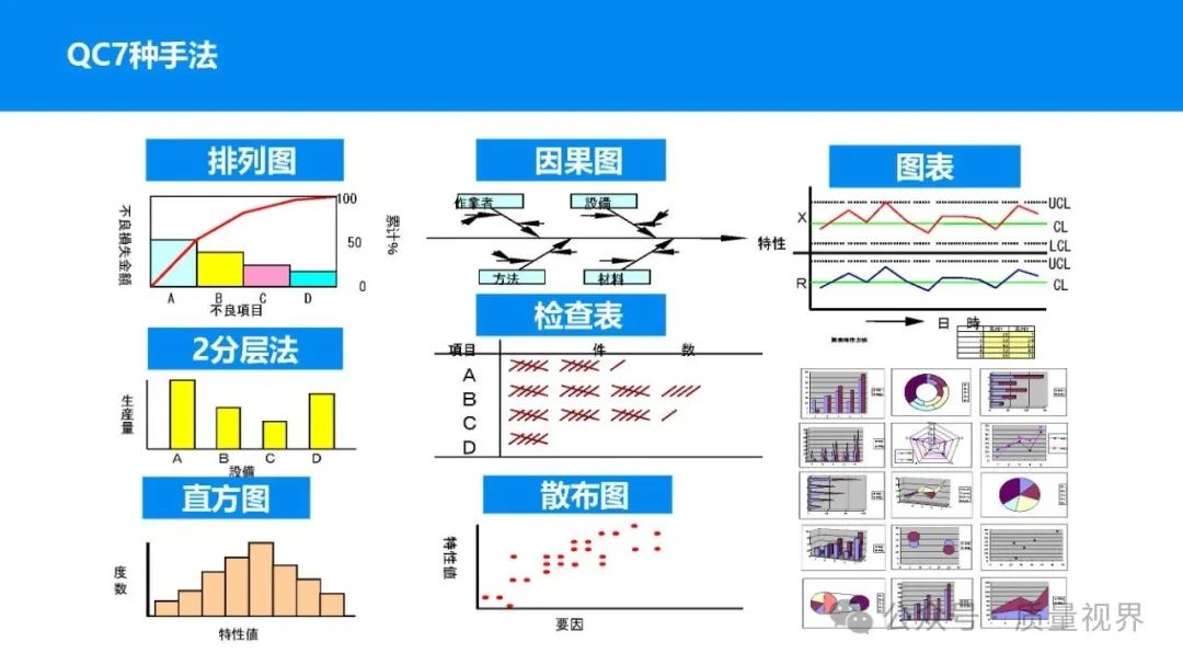 在质量管理领域,七大工具是提升产品质量、优化流程的重要手段。它们操作简便、实用性强,能帮助我们从复杂的数据和现象中找到关键问题,为质量改进提供明确方向。以下将逐一介绍这七大工具。检查表是一种为收集和整理数据而设计的表格,它能让数据收集过程更有条理,避免遗漏关键信息。可以系统地收集特定问题的数据,为后续的分析提供可靠依据。比如在生产车间,可用于记录每天产品的不合格项数量及类型。(二)制作步骤明确收集数据的目的,比如是为了了解某产品的不合格原因分布。确定需要收集的数据项目,如不合格类型、发生时间、发生地点等。设计表格样式,将数据项目合理排列。确定数据收集的周期和负责人。按照表格要求进行数据填写。某电子厂为了解手机屏幕的不合格情况,设计检查表记录每天的不合格类型,如划痕、亮点、暗点等。一周后,通过检查表数据能直观看到划痕问题出现的次数最多,为后续解决该问题提供了数据支持。柏拉图又称排列图,它基于 “关键的少数,次要的多数” 原则,将数据按重要程度排序,以柱状图和折线图结合的形式展示,帮助识别主要问题。能快速找出影响质量的主要因素,让我们把精力集中在关键问题上,提高质量改进的效率。(二)制作步骤确定分析的问题和数据范围,比如某产品的不合格原因及对应数量。对数据进行分类统计,计算各类别的数量和占比。按数量从大到小排序。绘制柱状图,横轴为类别,纵轴为数量;再绘制折线图,纵轴为累计占比。在累计占比 80% 左右的位置画一条横线,横线左侧的类别即为主要问题。某服装加工厂对衬衫的不合格品进行统计,发现线头、尺寸偏差、面料瑕疵、纽扣松动等问题。通过制作柏拉图,发现线头和尺寸偏差的累计占比达到 80%,于是重点针对这两个问题进行改进,有效降低了不合格率。鱼骨图又称因果图,因其形状像鱼骨而得名。它将影响质量的因素按类别进行梳理,找出问题的根本原因。能全面、系统地分析问题产生的原因,避免遗漏,帮助找到根本解决办法,而不是只解决表面问题。(二)制作步骤明确需要分析的质量问题,写在鱼骨的 “鱼头” 位置。确定主要原因类别,通常包括人、机、料、法、环、测等,作为鱼骨的主骨。针对每个主骨,进一步分析次要原因,作为子骨。继续深入分析,找出更具体的原因,直到能采取措施解决为止。对分析出的原因进行筛选,确定根本原因。某食品厂生产的饼干出现口感偏硬的问题,用鱼骨图分析。从人(操作工人烘焙时间控制不当)、机(烤箱温度不稳定)、料(面粉含水量过高)、法(烘焙工艺参数不合理)、环(车间湿度大)、测(温度检测仪器不准)等方面入手,最终发现烤箱温度不稳定和烘焙工艺参数不合理是根本原因。直方图是将数据按一定区间分组,以矩形的高度表示每组数据的频数,从而展示数据的分布状态。能直观地反映数据的分布特征,如数据的集中程度、离散程度、是否存在异常值等,帮助判断生产过程是否稳定。(二)制作步骤收集数据,确定数据的数量,一般建议不少于 50 个。找出数据中的最大值和最小值,计算极差(最大值 - 最小值)。确定组数和组距,组数通常根据数据数量确定,组距 = 极差 ÷ 组数。确定每组的区间范围,注意区间要连续且不重叠。统计每组数据的频数。绘制直方图,横轴为数据区间,纵轴为频数。某机械厂对零件的直径进行测量,得到一批数据。通过绘制直方图,发现数据呈现正态分布,且在标准范围内,说明生产过程稳定。若直方图出现偏态或有数据超出标准范围,则表明生产过程存在问题,需及时调整。控制图是用于监控生产过程是否处于稳定状态的工具,通过设置控制界限,判断过程是否出现异常波动。能及时发现生产过程中的异常情况,以便采取措施进行调整,预防不合格品的产生,保证生产过程的稳定性。(二)制作步骤确定需要监控的质量特性,如产品的尺寸、重量等。收集数据,按时间顺序或批次分组。计算每组数据的平均值(或中位数)和极差(或标准差)。确定控制界限,通常包括中心线(CL)、上控制限(UCL)和下控制限(LCL),一般以 ±3 倍标准差作为控制限。绘制控制图,横轴为样本组序号,纵轴为质量特性值,标注中心线和控制限,并将数据点绘制在图上。分析控制图,若数据点在控制限内且随机分布,说明过程稳定;若出现数据点超出控制限、连续多点在中心线一侧等情况,则表明过程异常。某饮料厂监控瓶装饮料的容量,通过控制图对每小时抽取的样本进行跟踪。当发现连续 3 个数据点在中心线以上且逐渐接近上控制限时,及时检查灌装设备,发现是设备压力异常,调整后恢复正常,避免了大量不合格产品的产生。散布图是用于研究两个变量之间相关关系的图形,通过观察数据点的分布形态,判断变量之间是正相关、负相关、不相关还是非线性相关。能直观地展示两个变量之间的关系,帮助确定它们之间是否存在因果关系或关联程度,为质量改进提供依据。(二)制作步骤确定需要研究的两个变量,如温度和产品合格率。收集成对的数据,一般建议不少于 30 对。建立坐标系,横轴为一个变量,纵轴为另一个变量。将每对数据对应的点绘制在坐标系中。观察数据点的分布形态,判断相关关系。某化工企业研究反应温度与产品纯度的关系,绘制散布图后发现,随着温度的升高,产品纯度先上升后下降,