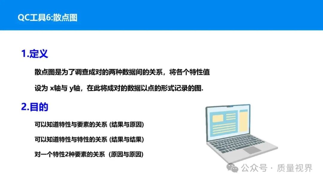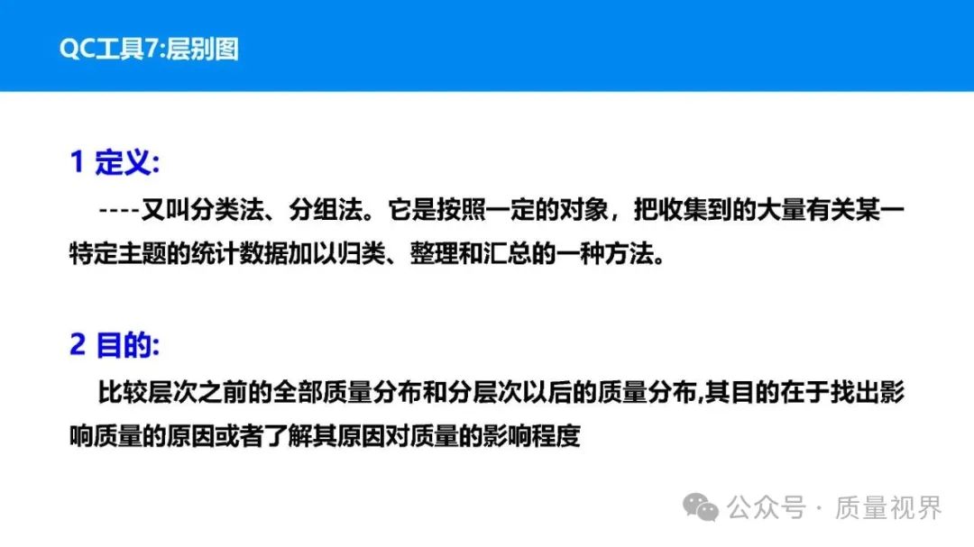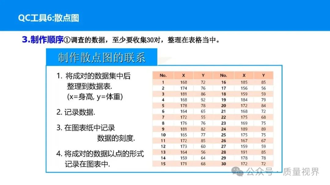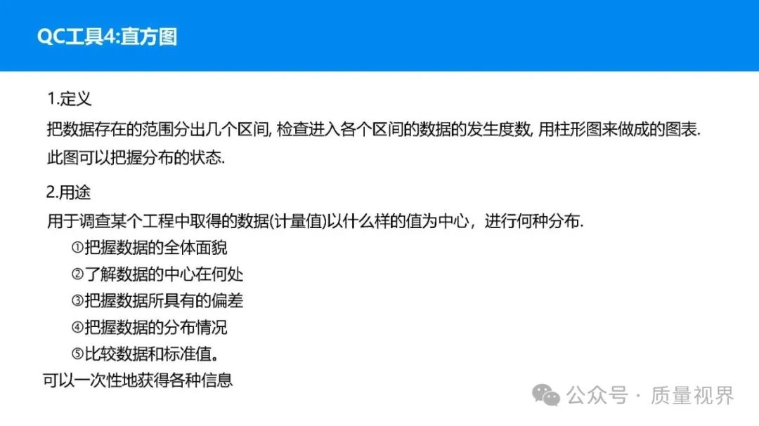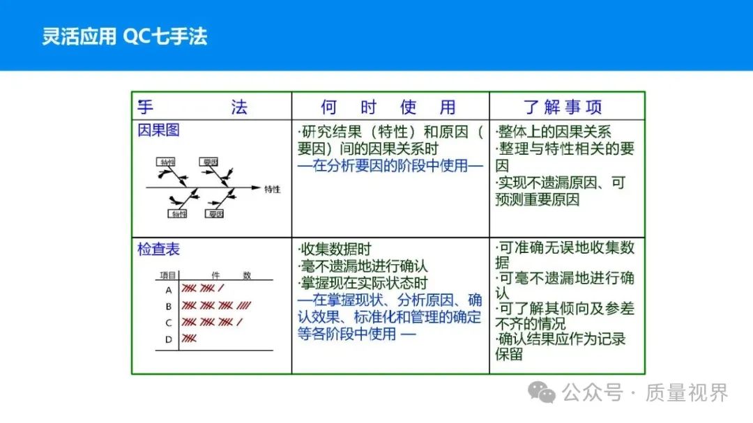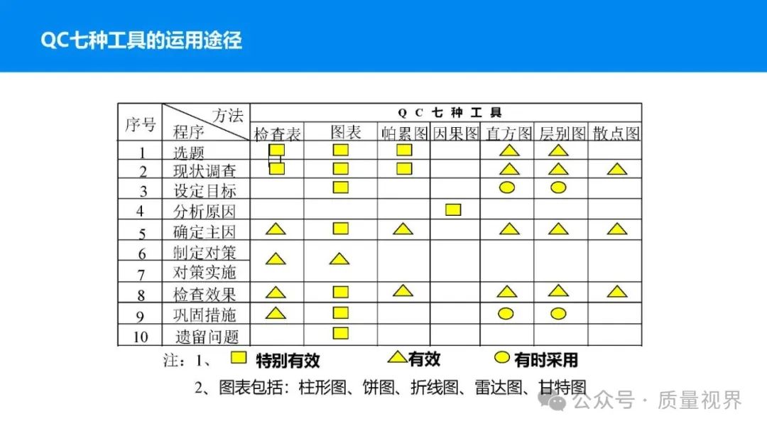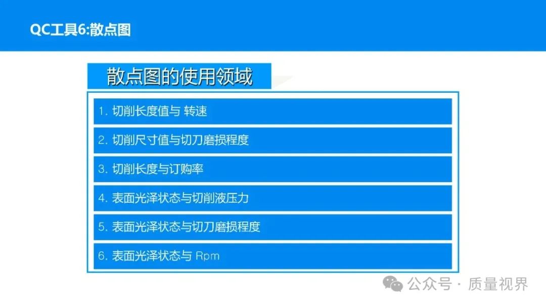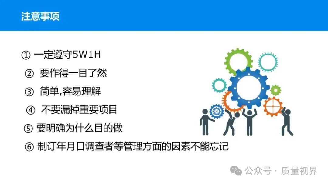 在质量管理领域,七大工具是提升产品质量、优化流程的重要手段。它们操作简便、实用性强,能帮助我们从复杂的数据和现象中找到关键问题,为质量改进提供明确方向。以下将逐一介绍这七大工具。检查表是一种为收集和整理数据而设计的表格,它能让数据收集过程更有条理,避免遗漏关键信息。可以系统地收集特定问题的数据,为后续的分析提供可靠依据。比如在生产车间,可用于记录每天产品的不合格项数量及类型。(二)制作步骤明确收集数据的目的,比如是为了了解某产品的不合格原因分布。确定需要收集的数据项目,如不合格类型、发生时间、发生地点等。设计表格样式,将数据项目合理排列。确定数据收集的周期和负责人。按照表格要求进行数据填写。某电子厂为了解手机屏幕的不合格情况,设计检查表记录每天的不合格类型,如划痕、亮点、暗点等。一周后,通过检查表数据能直观看到划痕问题出现的次数最多,为后续解决该问题提供了数据支持。柏拉图又称排列图,它基于 “关键的少数,次要的多数” 原则,将数据按重要程度排序,以柱状图和折线图结合的形式展示,帮助识别主要问题。能快速找出影响质量的主要因素,让我们把精力集中在关键问题上,提高质量改进的效率。(二)制作步骤确定分析的问题和数据范围,比如某产品的不合格原因及对应数量。对数据进行分类统计,计算各类别的数量和占比。按数量从大到小排序。绘制柱状图,横轴为类别,纵轴为数量;再绘制折线图,纵轴为累计占比。在累计占比 80% 左右的位置画一条横线,横线左侧的类别即为主要问题。某服装加工厂对衬衫的不合格品进行统计,发现线头、尺寸偏差、面料瑕疵、纽扣松动等问题。通过制作柏拉图,发现线头和尺寸偏差的累计占比达到 80%,于是重点针对这两个问题进行改进,有效降低了不合格率。鱼骨图又称因果图,因其形状像鱼骨而得名。它将影响质量的因素按类别进行梳理,找出问题的根本原因。能全面、系统地分析问题产生的原因,避免遗漏,帮助找到根本解决办法,而不是只解决表面问题。(二)制作步骤明确需要分析的质量问题,写在鱼骨的 “鱼头” 位置。确定主要原因类别,通常包括人、机、料、法、环、测等,作为鱼骨的主骨。针对每个主骨,进一步分析次要原因,作为子骨。继续深入分析,找出更具体的原因,直到能采取措施解决为止。对分析出的原因进行筛选,确定根本原因。某食品厂生产的饼干出现口感偏硬的问题,用鱼骨图分析。从人(操作工人烘焙时间控制不当)、机(烤箱温度不稳定)、料(面粉含水量过高)、法(烘焙工艺参数不合理)、环(车间湿度大)、测(温度检测仪器不准)等方面入手,最终发现烤箱温度不稳定和烘焙工艺参数不合理是根本原因。直方图是将数据按一定区间分组,以矩形的高度表示每组数据的频数,从而展示数据的分布状态。能直观地反映数据的分布特征,如数据的集中程度、离散程度、是否存在异常值等,帮助判断生产过程是否稳定。(二)制作步骤收集数据,确定数据的数量,一般建议不少于 50 个。找出数据中的最大值和最小值,计算极差(最大值 - 最小值)。确定组数和组距,组数通常根据数据数量确定,组距 = 极差 ÷ 组数。确定每组的区间范围,注意区间要连续且不重叠。统计每组数据的频数。绘制直方图,横轴为数据区间,纵轴为频数。某机械厂对零件的直径进行测量,得到一批数据。通过绘制直方图,发现数据呈现正态分布,且在标准范围内,说明生产过程稳定。若直方图出现偏态或有数据超出标准范围,则表明生产过程存在问题,需及时调整。控制图是用于监控生产过程是否处于稳定状态的工具,通过设置控制界限,判断过程是否出现异常波动。能及时发现生产过程中的异常情况,以便采取措施进行调整,预防不合格品的产生,保证生产过程的稳定性。(二)制作步骤确定需要监控的质量特性,如产品的尺寸、重量等。收集数据,按时间顺序或批次分组。计算每组数据的平均值(或中位数)和极差(或标准差)。确定控制界限,通常包括中心线(CL)、上控制限(UCL)和下控制限(LCL),一般以 ±3 倍标准差作为控制限。绘制控制图,横轴为样本组序号,纵轴为质量特性值,标注中心线和控制限,并将数据点绘制在图上。分析控制图,若数据点在控制限内且随机分布,说明过程稳定;若出现数据点超出控制限、连续多点在中心线一侧等情况,则表明过程异常。某饮料厂监控瓶装饮料的容量,通过控制图对每小时抽取的样本进行跟踪。当发现连续 3 个数据点在中心线以上且逐渐接近上控制限时,及时检查灌装设备,发现是设备压力异常,调整后恢复正常,避免了大量不合格产品的产生。散布图是用于研究两个变量之间相关关系的图形,通过观察数据点的分布形态,判断变量之间是正相关、负相关、不相关还是非线性相关。能直观地展示两个变量之间的关系,帮助确定它们之间是否存在因果关系或关联程度,为质量改进提供依据。(二)制作步骤确定需要研究的两个变量,如温度和产品合格率。收集成对的数据,一般建议不少于 30 对。建立坐标系,横轴为一个变量,纵轴为另一个变量。将每对数据对应的点绘制在坐标系中。观察数据点的分布形态,判断相关关系。某化工企业研究反应温度与产品纯度的关系,绘制散布图后发现,随着温度的升高,产品纯度先上升后下降,