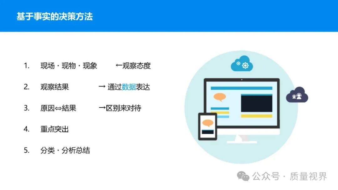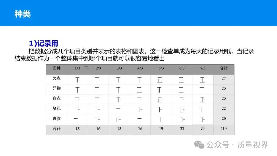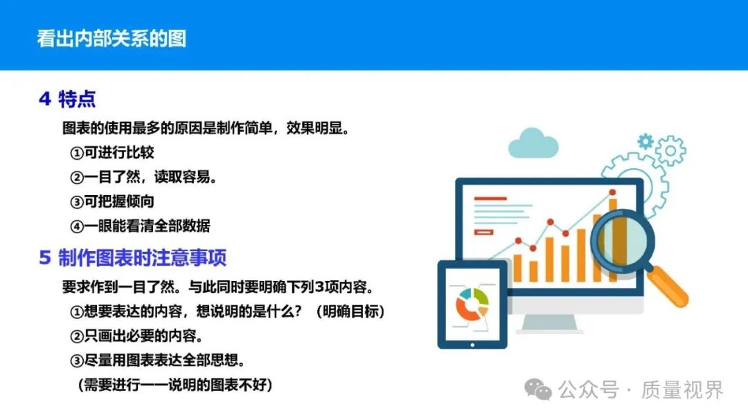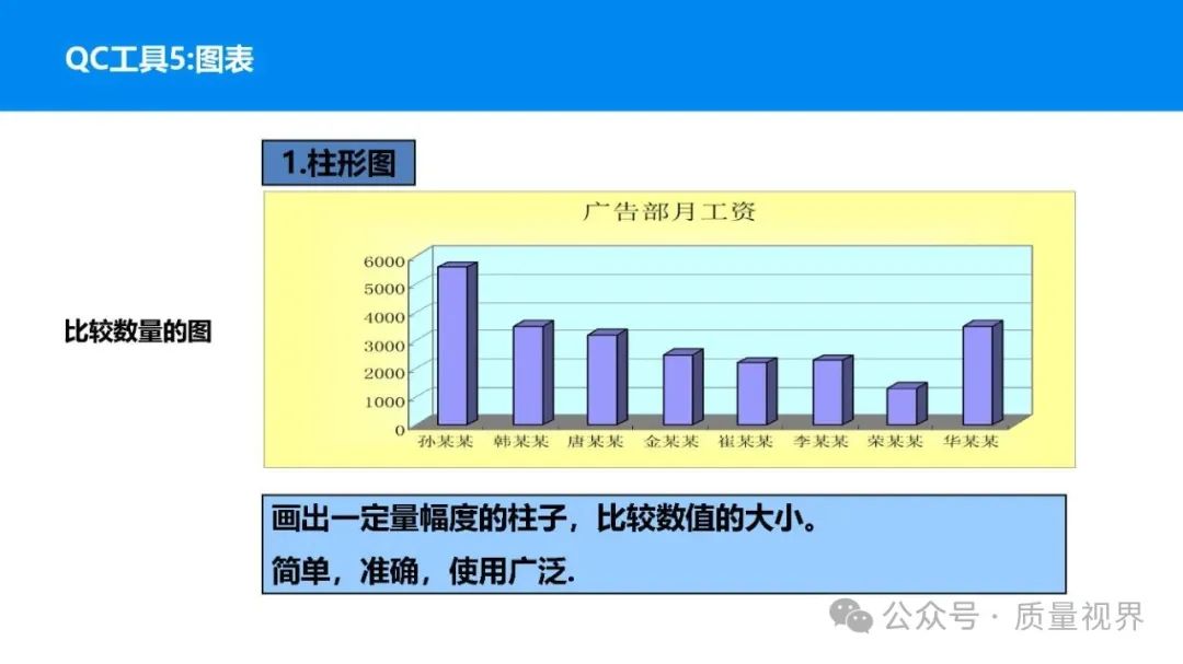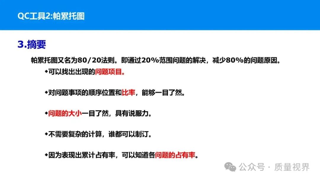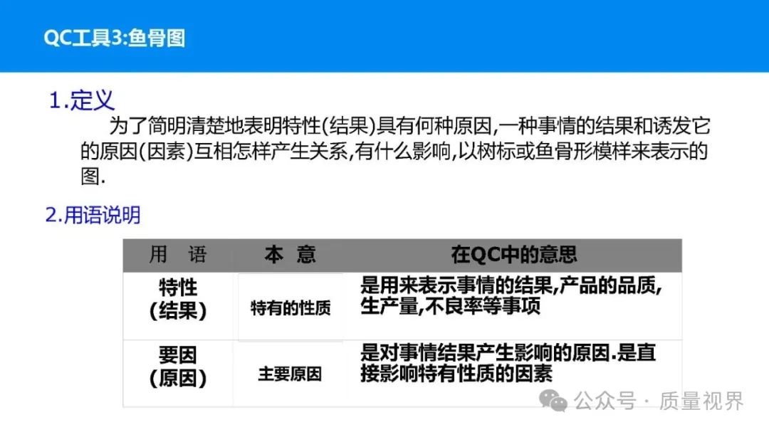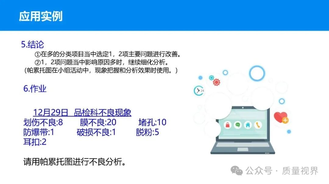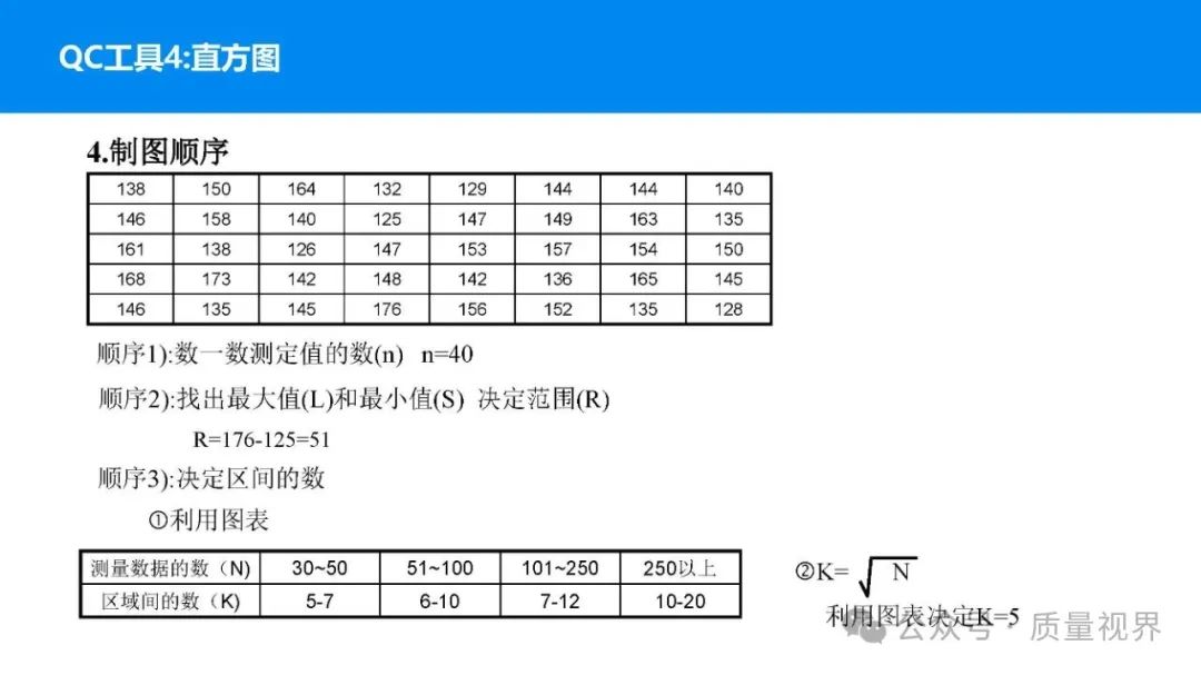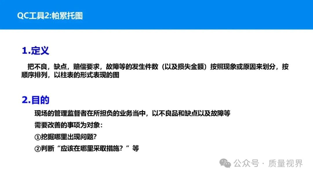 在质量管理领域,七大工具是提升产品质量、优化流程的重要手段。它们操作简便、实用性强,能帮助我们从复杂的数据和现象中找到关键问题,为质量改进提供明确方向。以下将逐一介绍这七大工具。检查表是一种为收集和整理数据而设计的表格,它能让数据收集过程更有条理,避免遗漏关键信息。可以系统地收集特定问题的数据,为后续的分析提供可靠依据。比如在生产车间,可用于记录每天产品的不合格项数量及类型。(二)制作步骤明确收集数据的目的,比如是为了了解某产品的不合格原因分布。确定需要收集的数据项目,如不合格类型、发生时间、发生地点等。设计表格样式,将数据项目合理排列。确定数据收集的周期和负责人。按照表格要求进行数据填写。某电子厂为了解手机屏幕的不合格情况,设计检查表记录每天的不合格类型,如划痕、亮点、暗点等。一周后,通过检查表数据能直观看到划痕问题出现的次数最多,为后续解决该问题提供了数据支持。柏拉图又称排列图,它基于 “关键的少数,次要的多数” 原则,将数据按重要程度排序,以柱状图和折线图结合的形式展示,帮助识别主要问题。能快速找出影响质量的主要因素,让我们把精力集中在关键问题上,提高质量改进的效率。(二)制作步骤确定分析的问题和数据范围,比如某产品的不合格原因及对应数量。对数据进行分类统计,计算各类别的数量和占比。按数量从大到小排序。绘制柱状图,横轴为类别,纵轴为数量;再绘制折线图,纵轴为累计占比。在累计占比 80% 左右的位置画一条横线,横线左侧的类别即为主要问题。某服装加工厂对衬衫的不合格品进行统计,发现线头、尺寸偏差、面料瑕疵、纽扣松动等问题。通过制作柏拉图,发现线头和尺寸偏差的累计占比达到 80%,于是重点针对这两个问题进行改进,有效降低了不合格率。鱼骨图又称因果图,因其形状像鱼骨而得名。它将影响质量的因素按类别进行梳理,找出问题的根本原因。能全面、系统地分析问题产生的原因,避免遗漏,帮助找到根本解决办法,而不是只解决表面问题。(二)制作步骤明确需要分析的质量问题,写在鱼骨的 “鱼头” 位置。确定主要原因类别,通常包括人、机、料、法、环、测等,作为鱼骨的主骨。针对每个主骨,进一步分析次要原因,作为子骨。继续深入分析,找出更具体的原因,直到能采取措施解决为止。对分析出的原因进行筛选,确定根本原因。某食品厂生产的饼干出现口感偏硬的问题,用鱼骨图分析。从人(操作工人烘焙时间控制不当)、机(烤箱温度不稳定)、料(面粉含水量过高)、法(烘焙工艺参数不合理)、环(车间湿度大)、测(温度检测仪器不准)等方面入手,最终发现烤箱温度不稳定和烘焙工艺参数不合理是根本原因。直方图是将数据按一定区间分组,以矩形的高度表示每组数据的频数,从而展示数据的分布状态。能直观地反映数据的分布特征,如数据的集中程度、离散程度、是否存在异常值等,帮助判断生产过程是否稳定。(二)制作步骤收集数据,确定数据的数量,一般建议不少于 50 个。找出数据中的最大值和最小值,计算极差(最大值 - 最小值)。确定组数和组距,组数通常根据数据数量确定,组距 = 极差 ÷ 组数。确定每组的区间范围,注意区间要连续且不重叠。统计每组数据的频数。绘制直方图,横轴为数据区间,纵轴为频数。某机械厂对零件的直径进行测量,得到一批数据。通过绘制直方图,发现数据呈现正态分布,且在标准范围内,说明生产过程稳定。若直方图出现偏态或有数据超出标准范围,则表明生产过程存在问题,需及时调整。控制图是用于监控生产过程是否处于稳定状态的工具,通过设置控制界限,判断过程是否出现异常波动。能及时发现生产过程中的异常情况,以便采取措施进行调整,预防不合格品的产生,保证生产过程的稳定性。(二)制作步骤确定需要监控的质量特性,如产品的尺寸、重量等。收集数据,按时间顺序或批次分组。计算每组数据的平均值(或中位数)和极差(或标准差)。确定控制界限,通常包括中心线(CL)、上控制限(UCL)和下控制限(LCL),一般以 ±3 倍标准差作为控制限。绘制控制图,横轴为样本组序号,纵轴为质量特性值,标注中心线和控制限,并将数据点绘制在图上。分析控制图,若数据点在控制限内且随机分布,说明过程稳定;若出现数据点超出控制限、连续多点在中心线一侧等情况,则表明过程异常。某饮料厂监控瓶装饮料的容量,通过控制图对每小时抽取的样本进行跟踪。当发现连续 3 个数据点在中心线以上且逐渐接近上控制限时,及时检查灌装设备,发现是设备压力异常,调整后恢复正常,避免了大量不合格产品的产生。散布图是用于研究两个变量之间相关关系的图形,通过观察数据点的分布形态,判断变量之间是正相关、负相关、不相关还是非线性相关。能直观地展示两个变量之间的关系,帮助确定它们之间是否存在因果关系或关联程度,为质量改进提供依据。(二)制作步骤确定需要研究的两个变量,如温度和产品合格率。收集成对的数据,一般建议不少于 30 对。建立坐标系,横轴为一个变量,纵轴为另一个变量。将每对数据对应的点绘制在坐标系中。观察数据点的分布形态,判断相关关系。某化工企业研究反应温度与产品纯度的关系,绘制散布图后发现,随着温度的升高,产品纯度先上升后下降,
