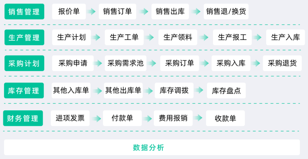 • 后来才慢慢扩展到采购、销售、生产、库存。