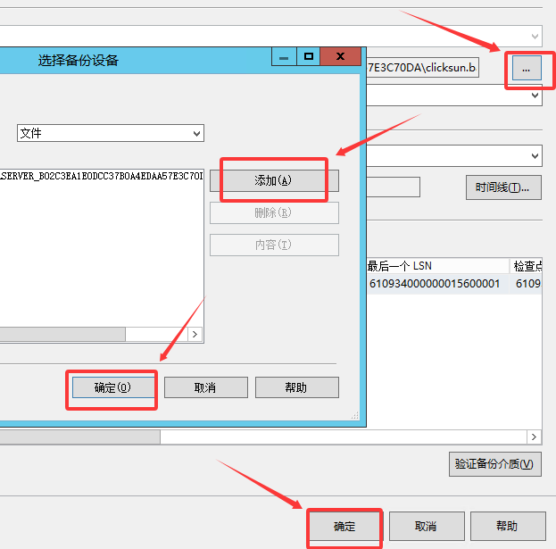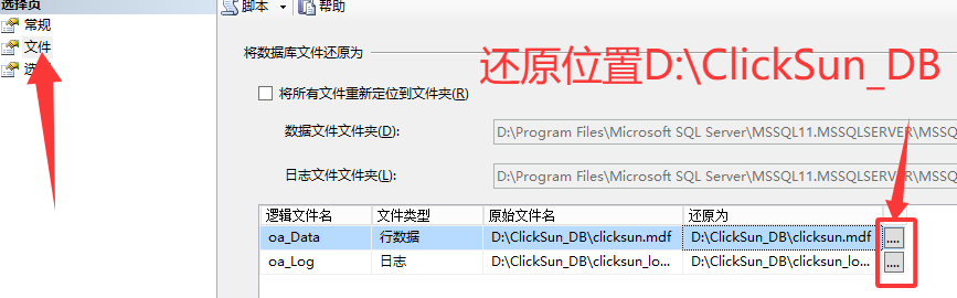 3、“文件”中设置还原数据库后的文件存放位置为D:\ClickSun_DB\clicksun.mdf、D:\ClickSun_DB\clicksun_log.ldf