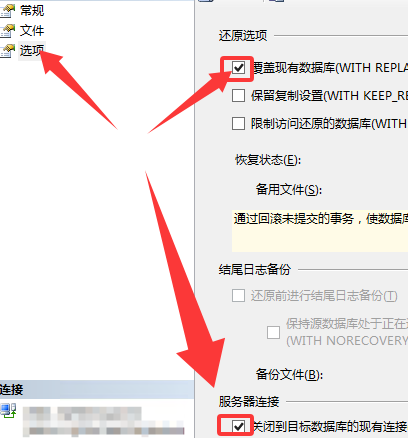 4、“选项”中选择“覆盖现有数据库”和“关闭现有连接”