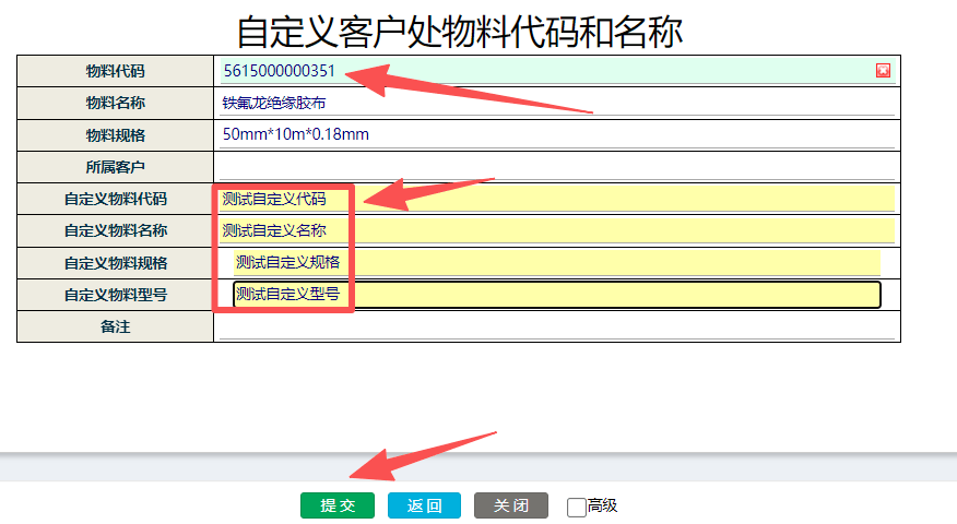 进入界面,点击选择需要自定义的原始料号,录入自定义料号,自定义名称,自定义规格,自定义型号提交完成