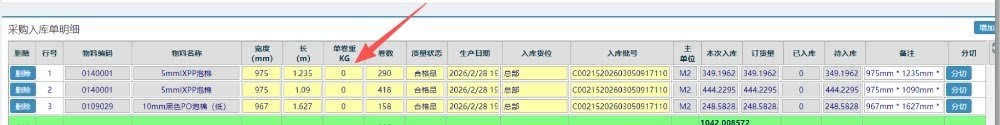 进入界面后,表格维护勾上对应的栏位“单卷重量”,重载界面后,即可录入对应的KG数值