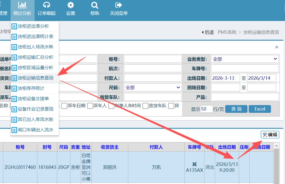 操作步骤:统计分析-货柜运输信息查询,通过查询条件找到对应的运输单,选择单据后,点击编辑,如下图所示: