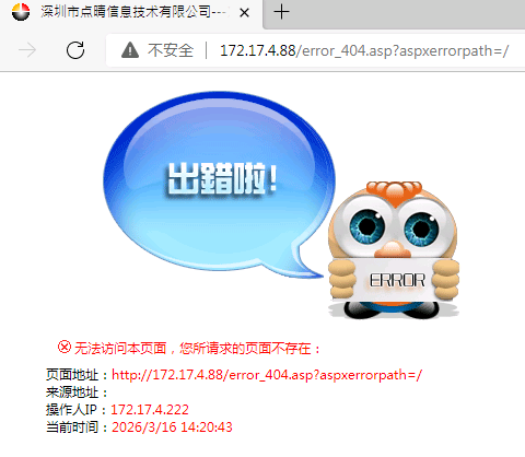 访问点晴永久免费OA系统提示错误:无法访问本页面,您所请求的页面不存在,页面地址:error_404.asp