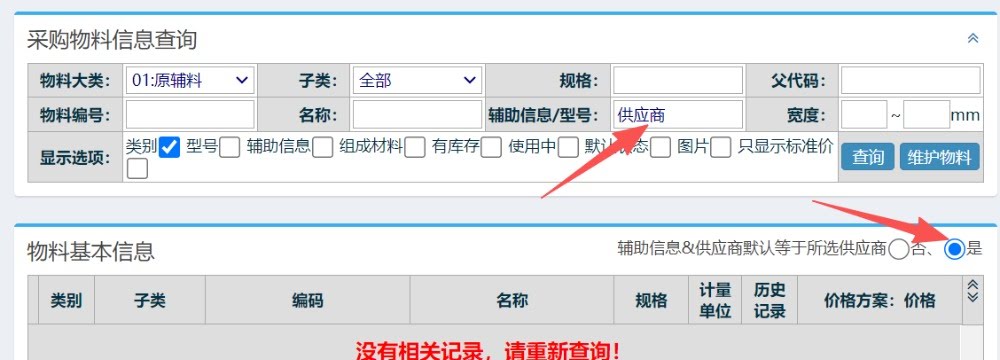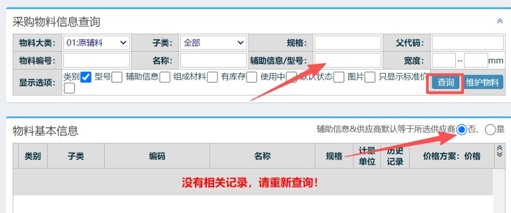 遇到此情况,需要先把选择栏位勾选成否,清空辅助信息/型号栏位,再点击查询操作,这样的话,下次进入界面就是正常显示了,如下图所示: