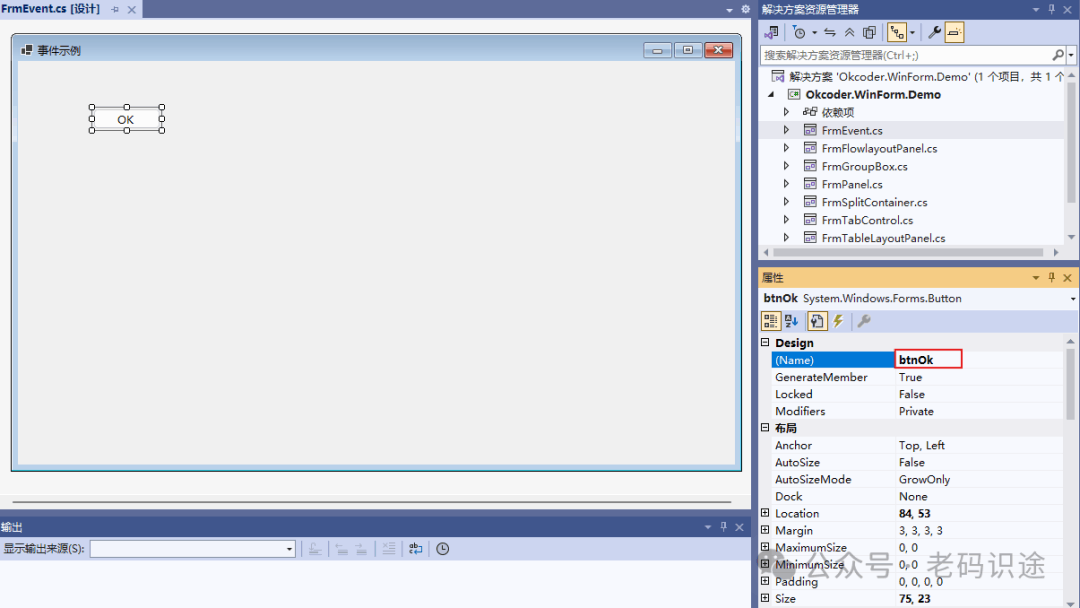 1. 在Form窗体中添加一个按钮控件,并命名为btnOk,设置Text属性为OK,如下所示: