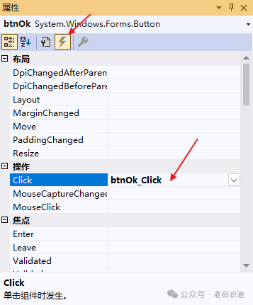 2. 在属性窗口切换到事件Tab页(⚡️),在Click事件右侧的框中双击,VisualStudio设计器,会自动生成btnOk_Click事件处理方法,如下图所示: