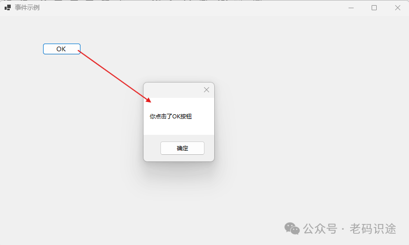 private void btnOk_Click(object sender, EventArgs e) { MessageBox.Show("你点击了OK按钮"); } }}