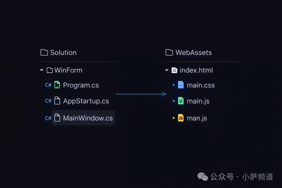 嵌入式资源:把 HTML/CSS/JS 文件作为嵌入资源编译到程序集里,发布时一个 EXE 走天下,适合正式发布。