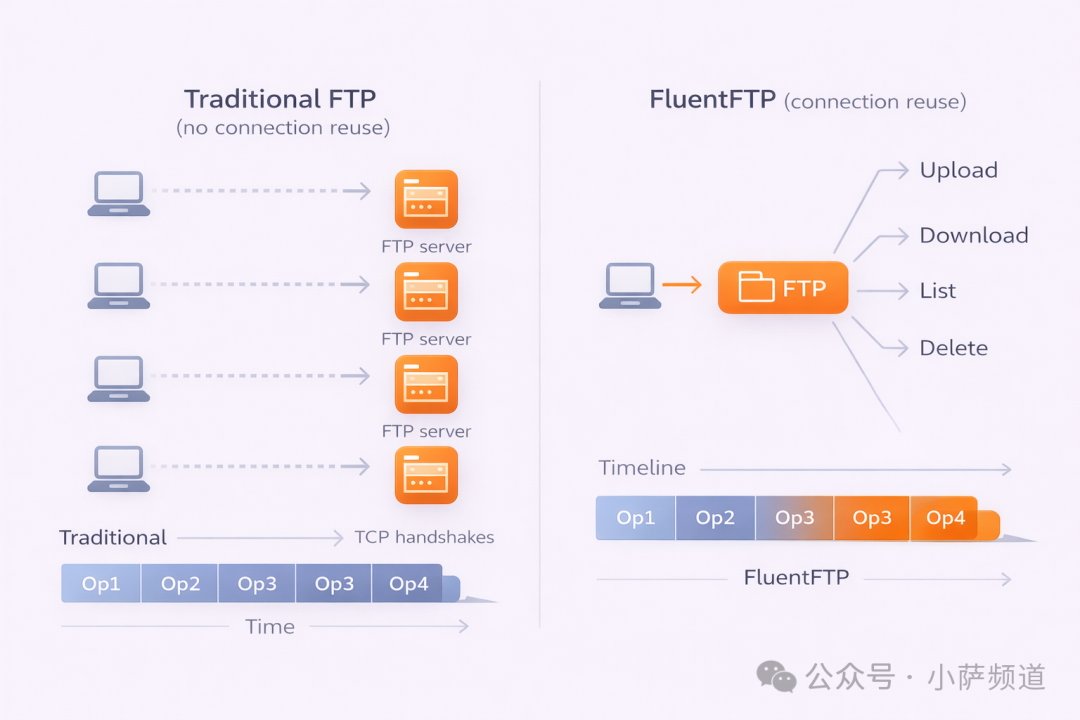 FluentFTP的每个操作都有异步版本。异步模式下多次文件操作可以复用同一个连接,不需要每次操作都重新握手。对于需要频繁FTP操作的后台服务来说,这个区别是性能和资源占用的差距。