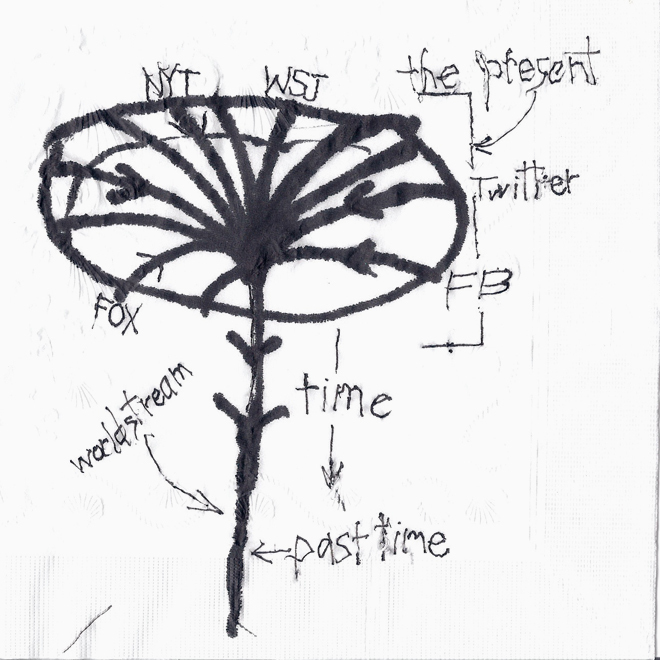 这种由错杂元素组成、内容可搜索且即时的“生活流”,通常会以博文、RSS订阅源、推文、对话流、Facebook页面及时间轴的形式呈现。其结构也正代表着一种由“平台”向“流”方向的转变,而这种“流”也正可以用来表征具体的时间。