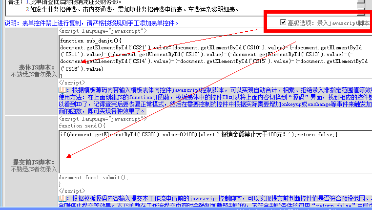 点晴OA系统工作流的常规功能虽然比较简单,但也提供了高级设计模式,如果用户会一定的javascript基础,也能做出很好的效果的,包括申请表数据自动汇总、判断是否符合设定规则、不符合规则时禁止提交或自动跳转到其他页面等效果,读取页面上任意一个控件的数据值也是不在话下的。由于条件格式判断走向的流程设计对一般没有专职网管的中小企业而言还是比较难的,所以我们也没有做深入的开发,但也可以实现一些不错的效果。具体的例子可以参照点晴官网在线试用网站工作流管理中的:新品定价表、差旅费报销单等例子的。实现这项功能是需要在设计模板的时候启用:高级选项:录入javascript脚本,见下图: