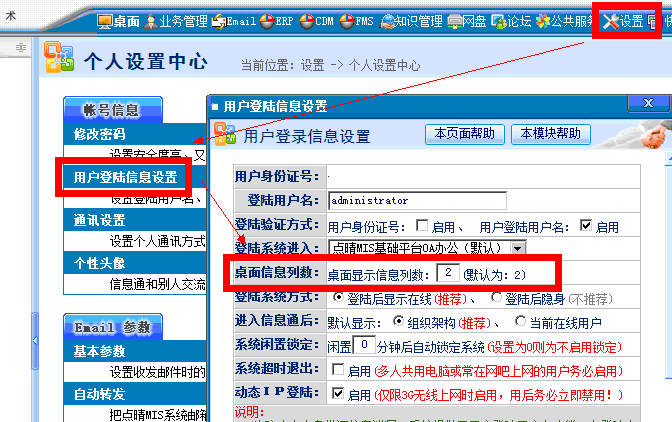 至于进入桌面后信息窗口排列只有两列、屏幕高分辨率下右侧大片空白的问题,已经增加了个人自定义显示信息窗口列数,用户可以单独个别自定义1~9列之间显示,下载一下系统最新升级包在安装了点晴OA系统的服务器执行一下即可。由于升级不大,所以本次升级未设置为自动升级提醒,需要用户自行下载以下补丁安装: