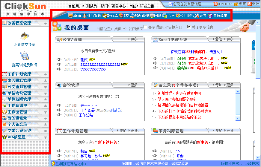 :界面的设计是见仁见智的,市面上大多数OA都是采用点选开启子菜单的方式显示,我们经过分析后认为不方便操作、效率低,而且在现在移动信息时代,很多时候还要照顾智能手机和平板电脑的操作需求,所以在界面的设计方面尽量采用图标式菜单或文字链接的方式。