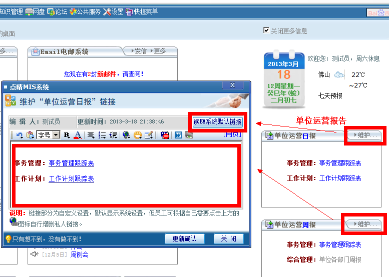 看不到的员工也可以自己编辑一下报告,参见下图。正常情况下要保持个人的内容为空。如果需要将自己私人查看的报告混合进去,可以点击“读取系统默认链接”,就可以将管理员统一配置的链接导入了,然后将自己的链接加入即可形成自己个性化的报告链接。缺点是管理员更新链接时,个人报告就不会自动读取管理员设置的信息了。