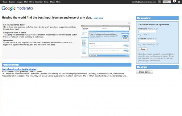 Google Moderator是一个分主题的公开论坛,用户可以在上面提问题、分享各种想法,让每个人的需求尽快得到反馈。