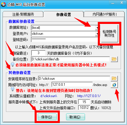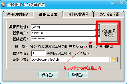 数据库访问地址一般为:(local)、登录用户为:clicksun、登录密码为:clicksun2010,如果通不过验证,则直接采用数据库的管理员账号:sa及其对应密码试试,一定要保证连接正常才行。