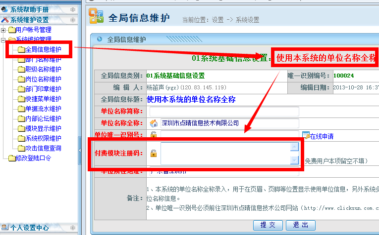 根据本单位的实际网络情形,填写完毕“在线申请”后,请耐心等待点晴公司工作人员人工审核。审核通过后,点晴公司将会自动发送审核通过的Email到您的注册邮箱中,然后您应该将邮件中通知的付费注册码保存到系统全局变量的相应维护页面中: