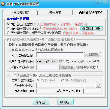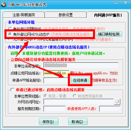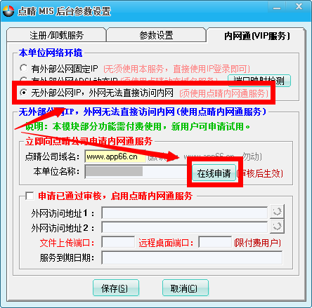 如果是上面第1类用户,那么此类用户无需启用点晴内网通(VIP服务),直接在路由器上简单设置一下端口转向,就可以方便的实现外网访问内部局域网的点晴MIS系统了,设置方法可参见本帖子(
