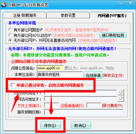 然后再返回到点晴MIS信息通后台程序中勾选对应的服务保存: