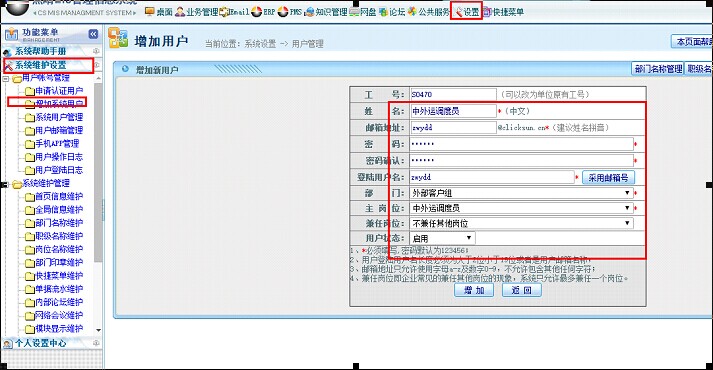 录入姓名、邮箱地址、密码、登录名、部门选择外部客户组、主岗位选择刚刚所添加的岗位中外运调度员